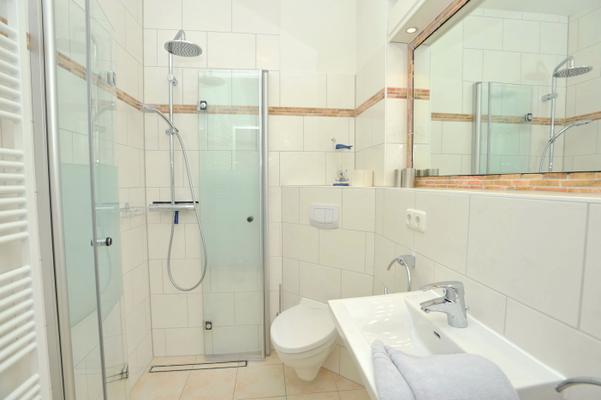 Im Erdgeschoß, befinden sich das große Wohn- und Esszimmer mit der angeschlossenen Landhausküche, ein komfortables Schlafzimmer mit Doppelbett, sowie zwei moderne Badezimmer mit Duschen und WC.