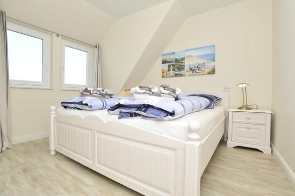 Im Obergeschoss gibt es ein weiteres Wohn-Esszimmer mit einer offenen Landhausküche sowie zwei weitere Schlafzimmer mit Doppelbetten und ein zusätzliches Duschbad mit WC.