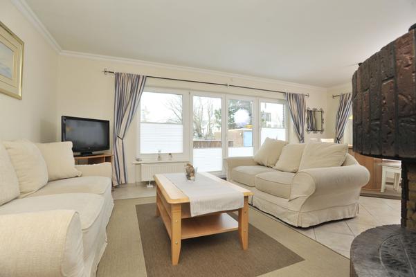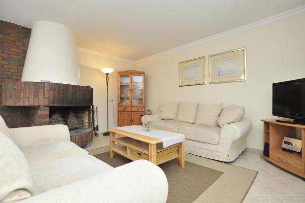 Im Wohnzimmer befindet sich auch ein Kamin.