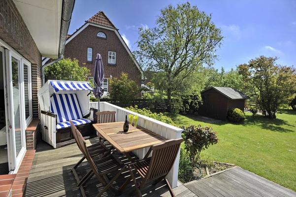 Appartement 1 bietet eine private Terrasse mit Strandkorb und Gartenmöbeln. Anliegend befindet sich ein großer Garten.