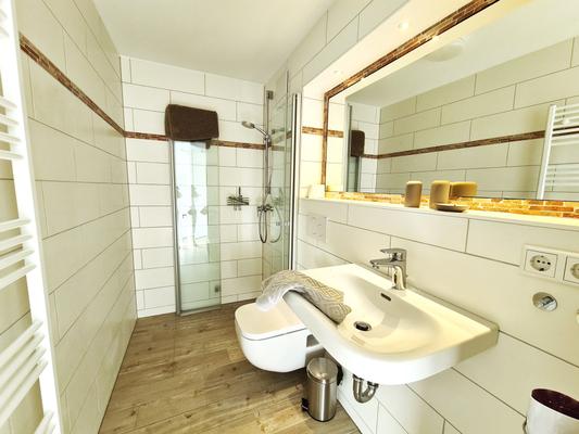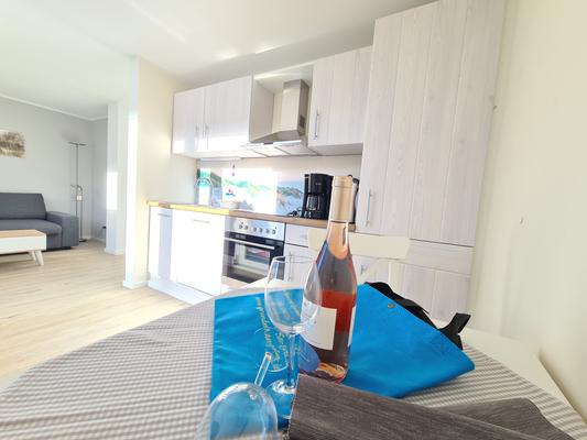 Die moderne Küchenzeile bietet eine vollausgestattete Kochmöglichkeit. Das schicke Duschbad ist mit einer bodengleichen Dusche ausgestattet.