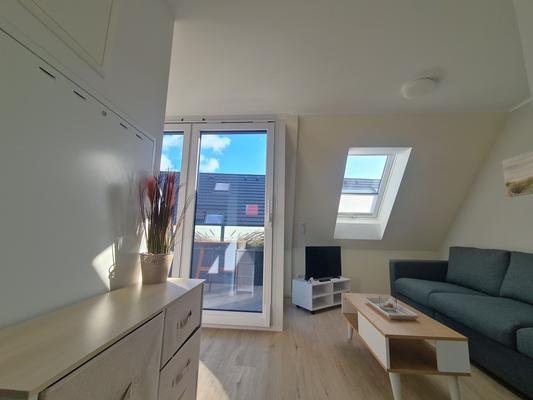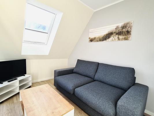 Das Wohnzimmer bietet eine gemütliche Schlafcouch zum Ausziehen.