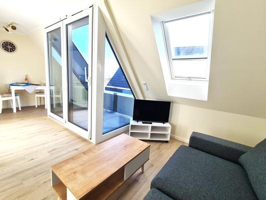 Das App 6 bietet ein gemütlichen Wohn- und Essbereich an, mit Austritt auf die eigene Loggia mit Gartenmöbel.